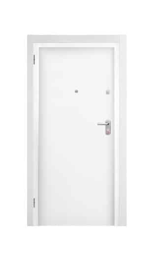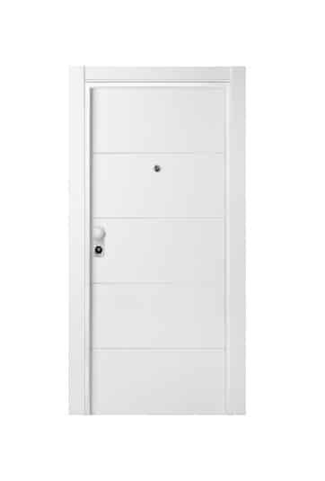 Puerta acorazada fabricada en aluminio y madera para uso exterior.